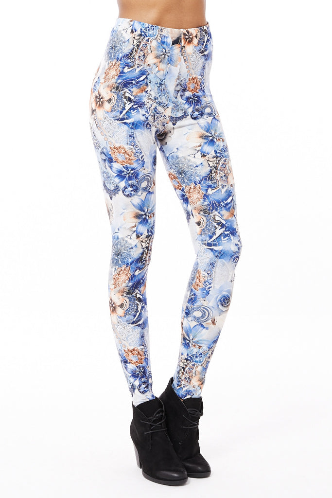 Blue Floral Leggings with Gold Pattern Detail. The fabulous blue floral leggings have flowers all over. There is a tiny dot gold swirl pattern in the shape of flowers all over too. They are stretchy for a perfect fit. The waist is elasticated with plenty of give. Lightweight and great...