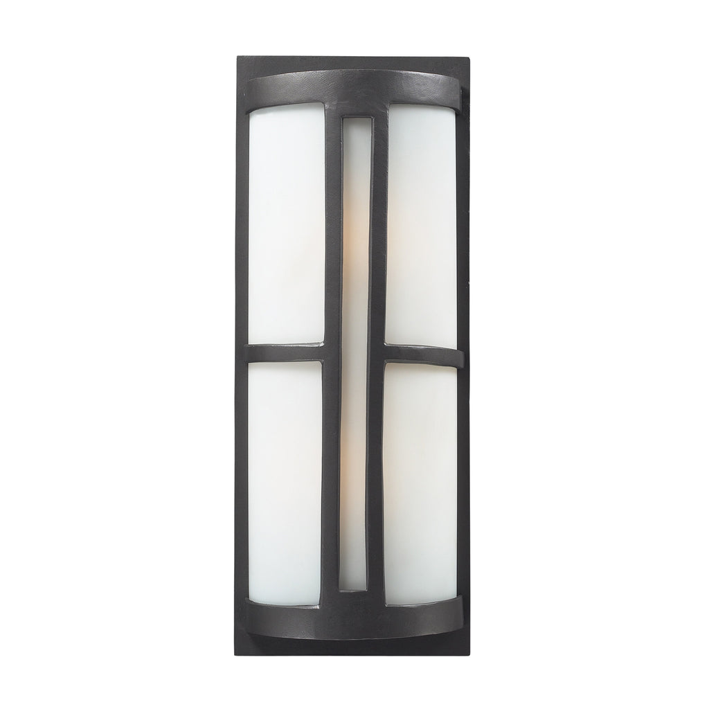 The Trevot Collection Emphasizes A Strong Geometric Design With Vertical And Horizontal Lines Surrounding A Half Cylindrical Shape. Frosted Glass Compliments The Sunset Silver Finish.Brand Information Brand:ELK Lighting Dimensions and Weight Dimensions:W:7 H:17 E:4 Weight: N/A Shipping Specifications Ships Via: UPS Design Finish:Graphite Bulb Type: 60W Med.